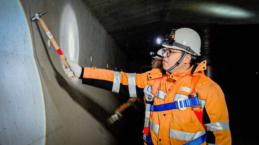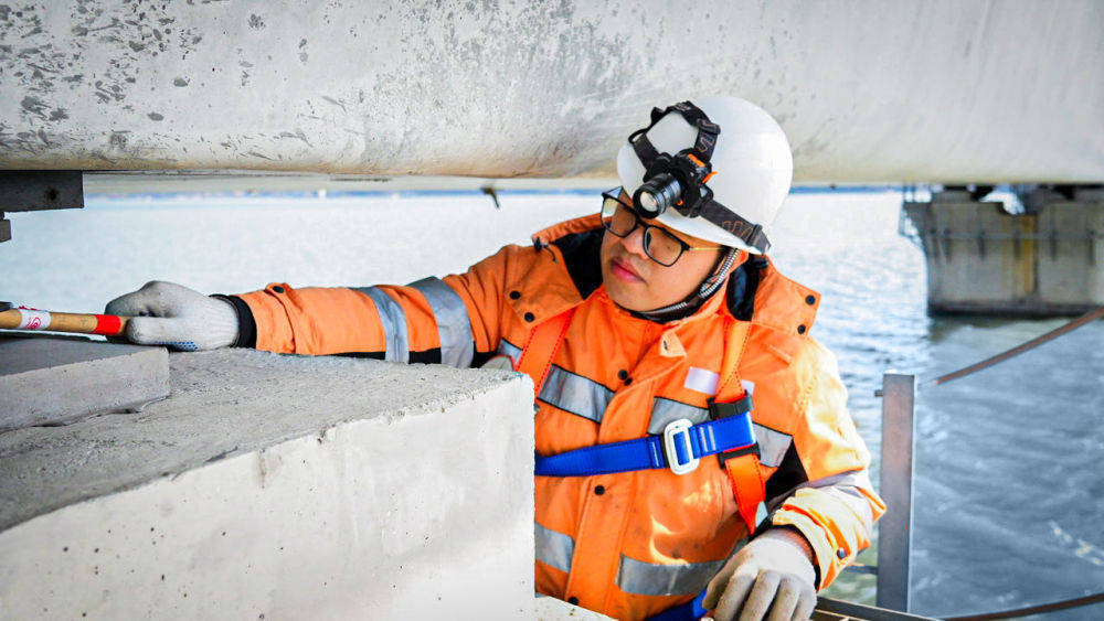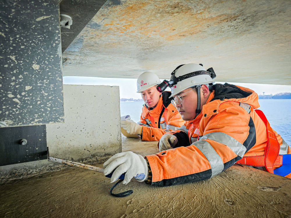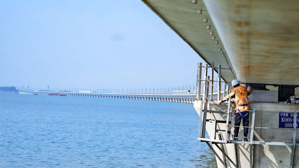 r桥体间的缝隙狭窄,进入大桥内部后更是伸手不见五指。上海高铁基础设施段湖州车间桥梁组工作人员借着头灯的光线,像啄木鸟为树木问诊一般,沿梁体一路进行听诊式的检查。