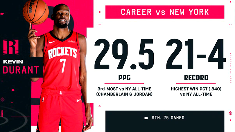 杜兰特生涯面对尼克斯场均29.5分,尼克斯对手中历史第三位,仅次于张伯伦和迈克尔-乔丹。