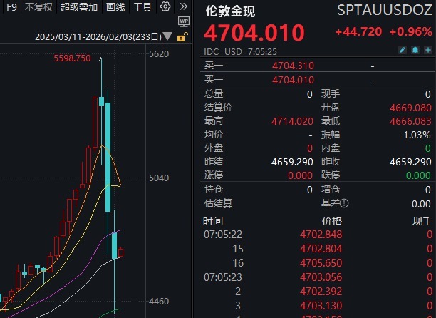 【大河财立方消息】2月3日盘中,现货黄金终止三连跌。截至发稿,伦敦金现上涨0.96%,报4704.01美元/盎司。