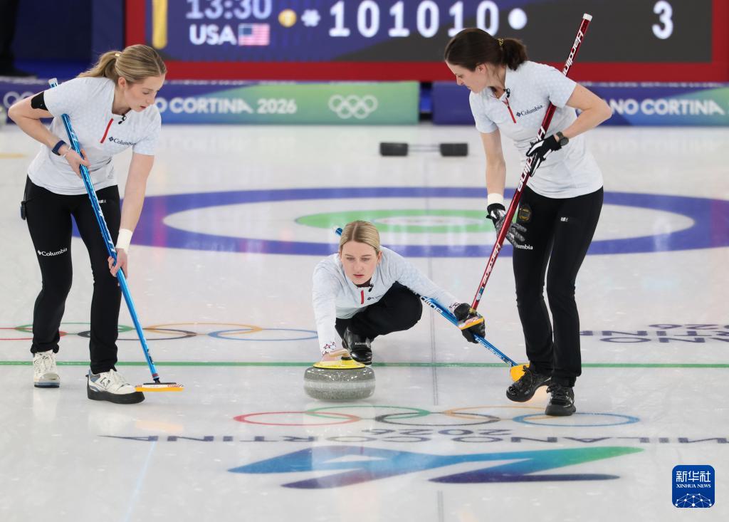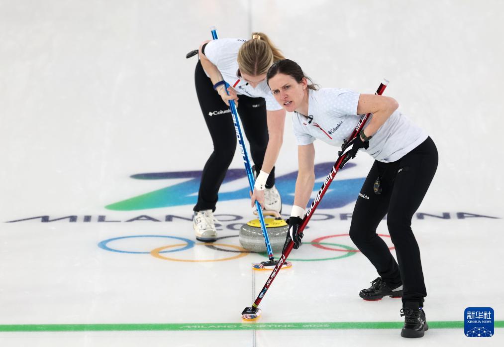 2月21日,美国队选手科里·蒂斯(中)在比赛中掷壶。